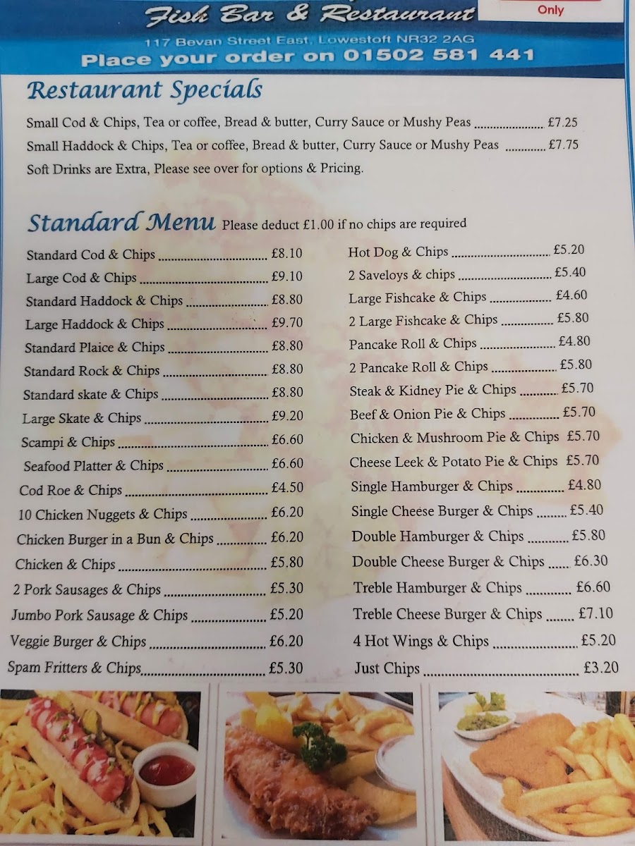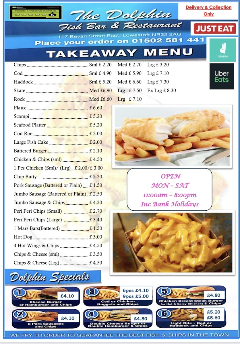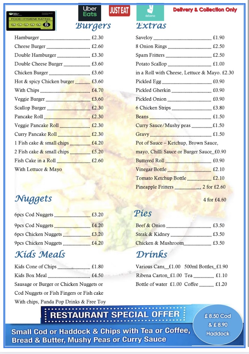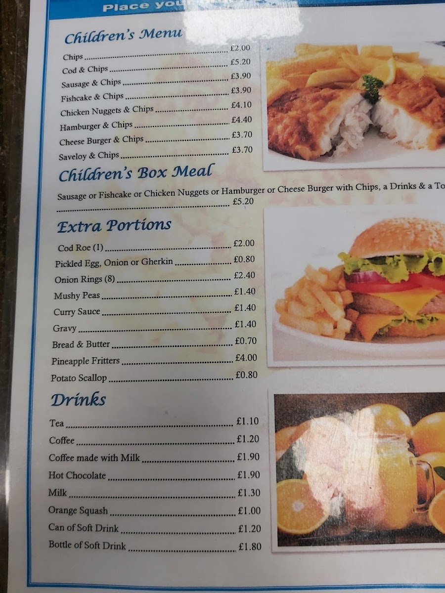 From a reviewer’s perspective, the menu at Dolphin Fish Bar And Restaurant at 117 Bevan St E, Lowestoft offers a classic British seaside experience with something for everyone. The burger selection features Hamburger, Cheese Burger, Double Hamburger, Double Cheese Burger, and Chicken Burger, while the nugget options include 6pcs Cod Nuggets, 9pcs Cod Nuggets, 6pcs Chicken Nuggets, and 9pcs Chicken Nuggets, perfect for both adults and children. The Kids Meals like Kids Cone Of Chips and Kids Box Meal cater to younger diners, while the Extras-including Saveloy, 8 Onion Rings, Spam Fritters, and Potato Scallop served In A Roll With Cheese, Lettuce & Mayo-allow for hearty add-ons. Traditional British pies, such as Beef & Onion and Steak & Kidney, sit alongside drinks including Coffee, Coffee Made With Milk, Hot Chocolate, Orange Squash, and various Cans 500ml Bottles or Ribena Carton. The children’s menu covers favorites like Chips, Cod & Chips, Sausage & Chips, Fishcake & Chips, and Chicken Nuggets & Chips, while extra portions of Cod Roe, Pickled Egg, Onion, Onion Rings, Mushy Peas, and Curry Sauce let diners customize their meals. The Dolphin Specials-from Cheese Burger Or Hamburger And Chips to 2 Pork Sausages And Chips, Cod Or Chicken Nuggets And Chips, and Double Cheese Burger Or Double Hamburger & Chips-highlight value and variety. Classic offerings are found under Restaurant Specials, including Small Cod & Chips and Small Haddock & Chips, while the standard menu ranges from Hot Dog & Chips and Large Fishcake & Chips to 2 Large Fishcake & Chips, Pancake Roll & Chips, and Standard Cod & Chips. Seafood lovers will also find Sausage, Haddock, Skate, Plaice, and Scampi available. Overall, the menu balances traditional fish and chip fare with burgers, nuggets, pies, and extras, ensuring a comforting and diverse selection that caters to both casual diners and families looking for a satisfying coastal meal.